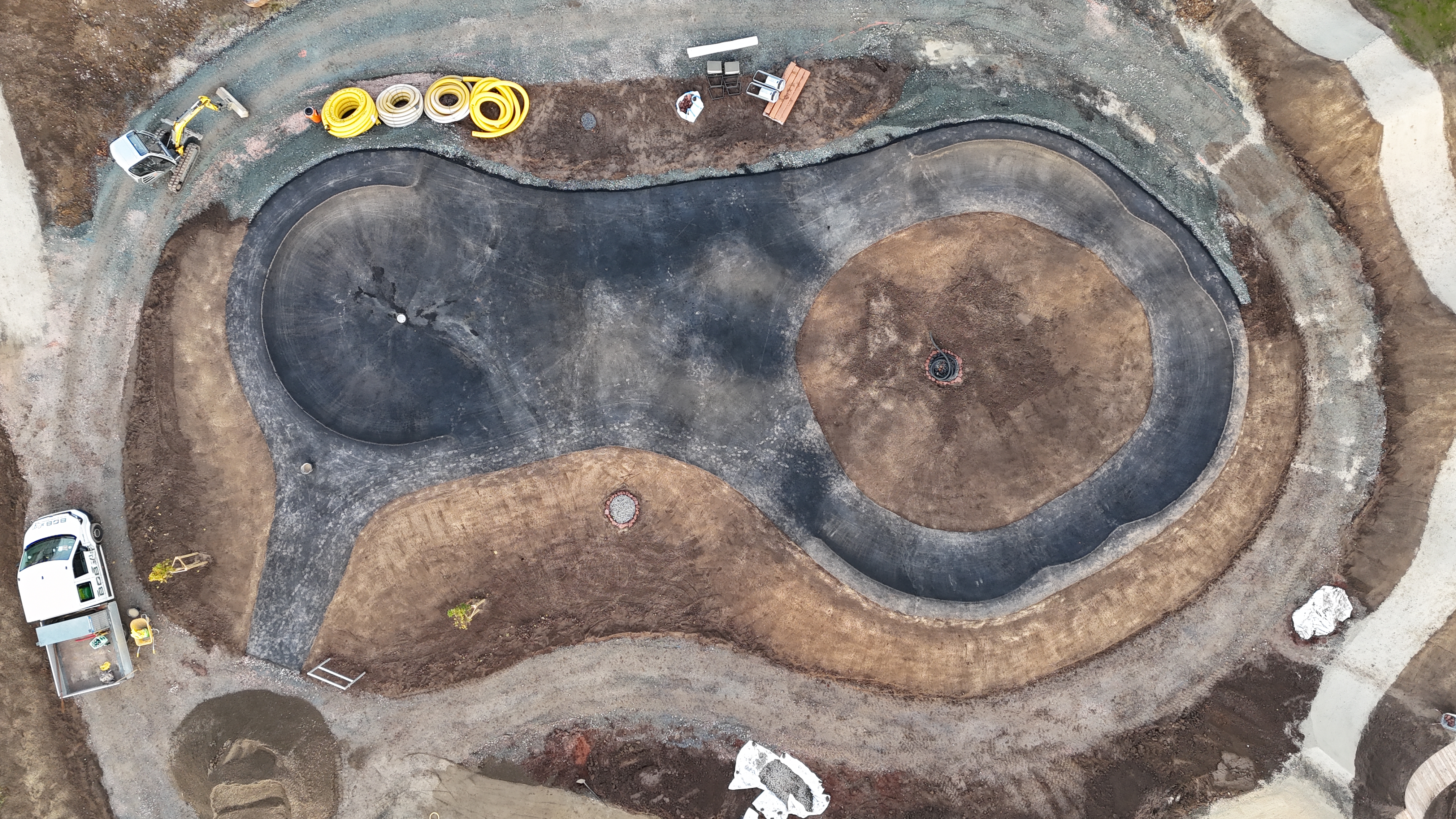 Die Fahrbahnen wurden mehrschichtig und robust aufgebaut und händisch profiliert, um präzise Formen und hohe Verdichtung zu gewährleisten. Aufenthaltsflächen und Wege wurden maschinell hergestellt.