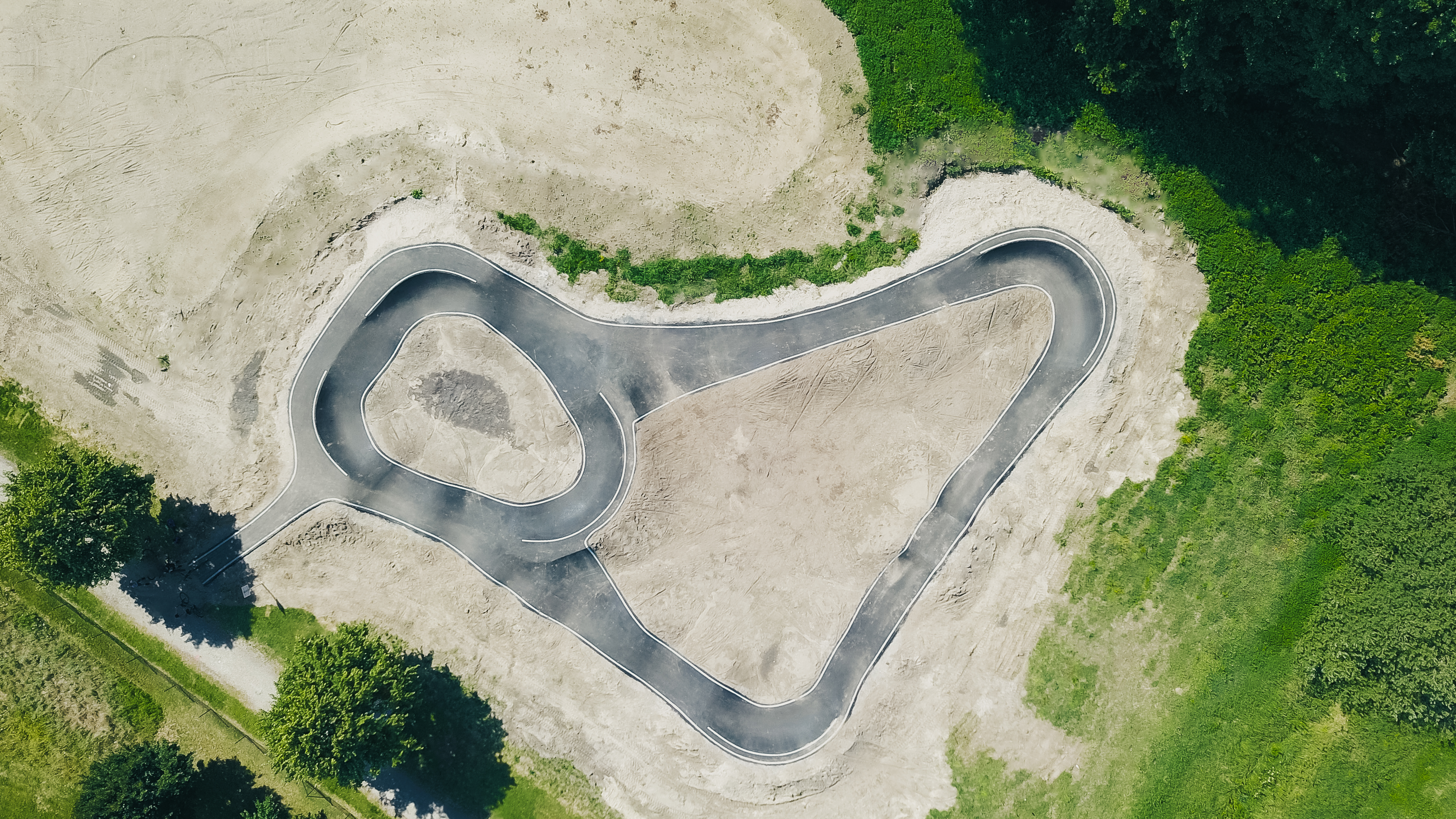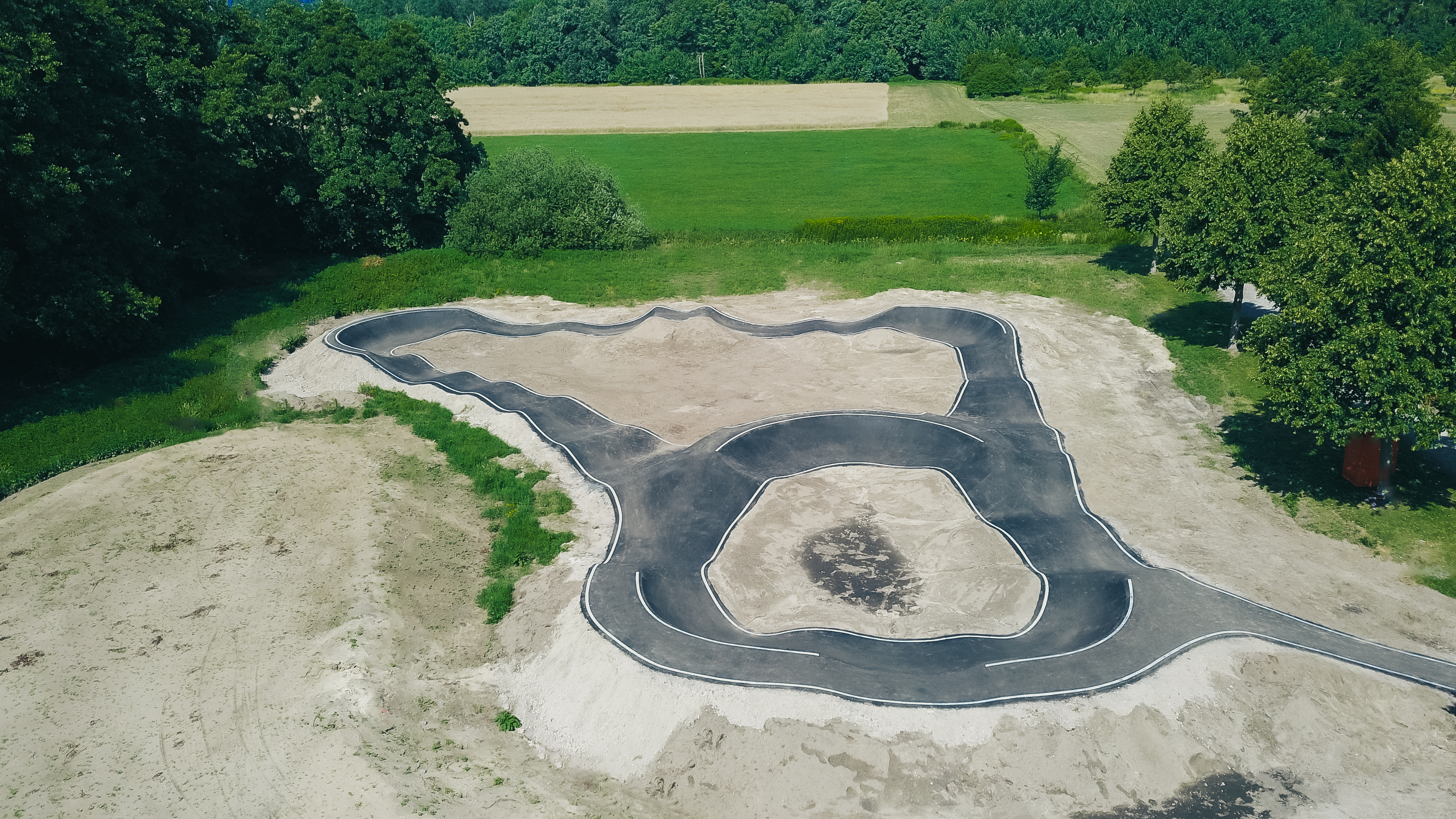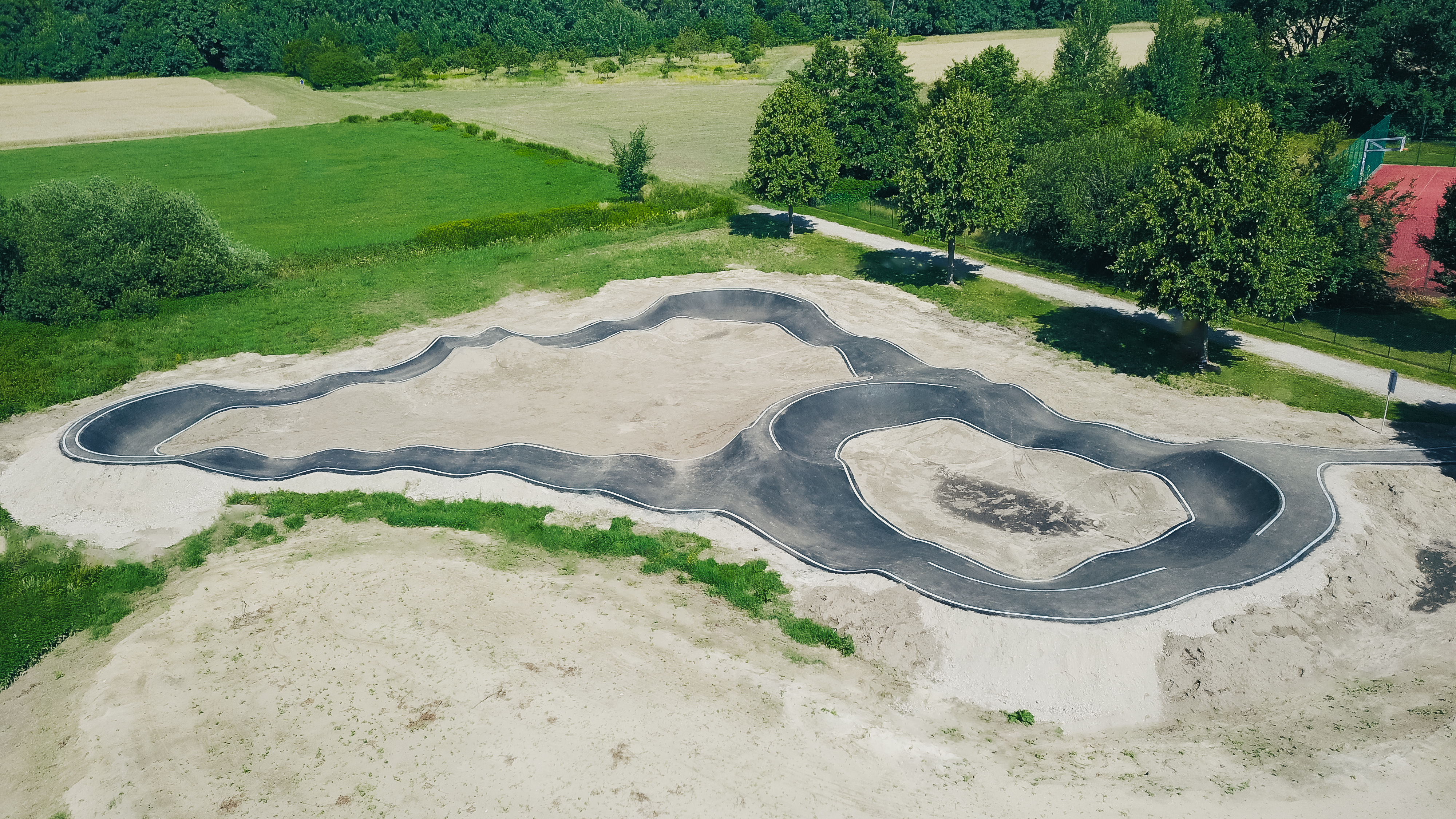 Auf rund 1.000 m² Grundfläche findet sich eine moderne Anlage mit zwei ineinandergreifenden Rundkursen, die sich nahtlos in den bestehenden Sportpark integriert.
